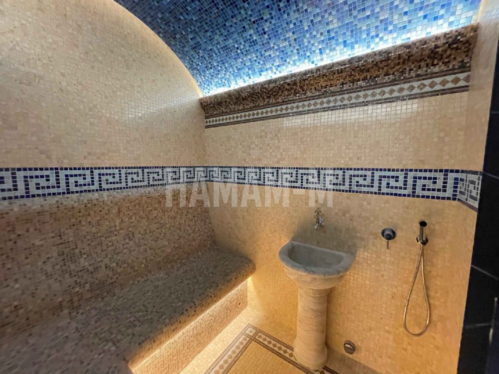 Общая площадь парной (при размерах 1,9х2,0 м) составляет 3,8 м2. Подобные хамамы обустраивают в квартирах или небольших частных домах с вместительной ванной комнатой. При этом к ванной предъявляются особые требования: высота потолков не ниже 3 метров, наличие необходимых инженерных коммуникаций – вытяжки, вентиляционной шахты, канализации и горячего водоснабжения.